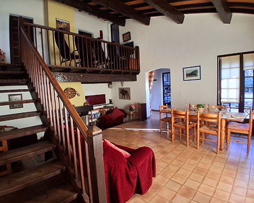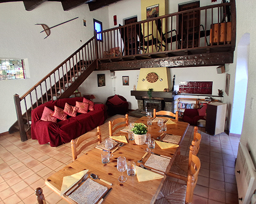 The dining-living room has french windows to the patio and features a sunken log burning fireplace with armchairs, copious beams, and open plan stairs leading to a mezzanine gallery from where there are; 2 twins and 1 double bedroom, with mountain views, one bathroom with shower and a separate toilet with basin and large shower cubicle. All three upper bedrooms are air conditioned.